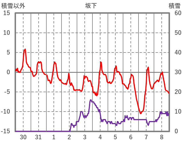 | 日 | 時 | 気温 | 降水 | 風向/風速 | 日照 | 積雪 | 降雪 |