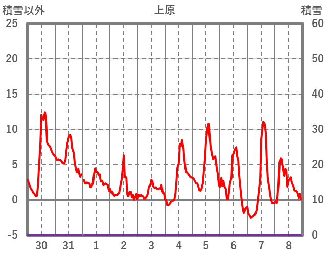 | 日 | 時 | 気温 | 降水 | 風向/風速 | 日照 | 積雪 | 降雪 |
