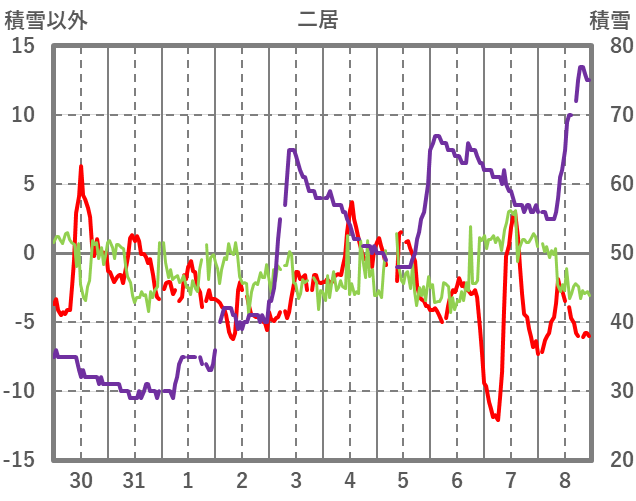 | 日 | 時 | 気温 | 降水 | 風向/風速 | 日照 | 積雪 | 降雪 |