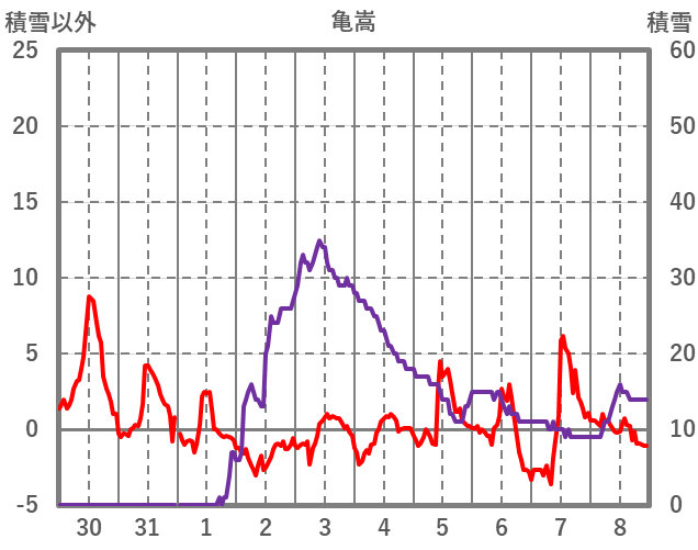 | 日 | 時 | 気温 | 降水 | 風向/風速 | 日照 | 積雪 | 降雪 |
