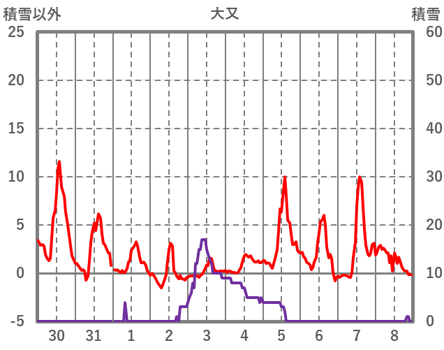 | 日 | 時 | 気温 | 降水 | 風向/風速 | 日照 | 積雪 | 降雪 |