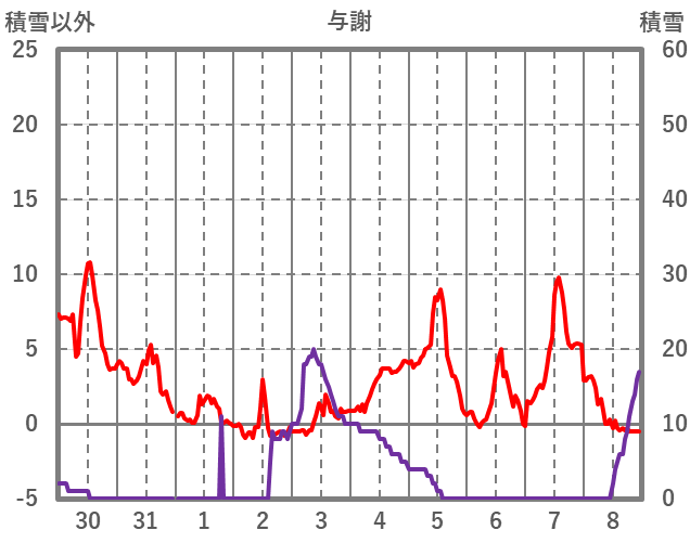 | 日 | 時 | 気温 | 降水 | 風向/風速 | 日照 | 積雪 | 降雪 |