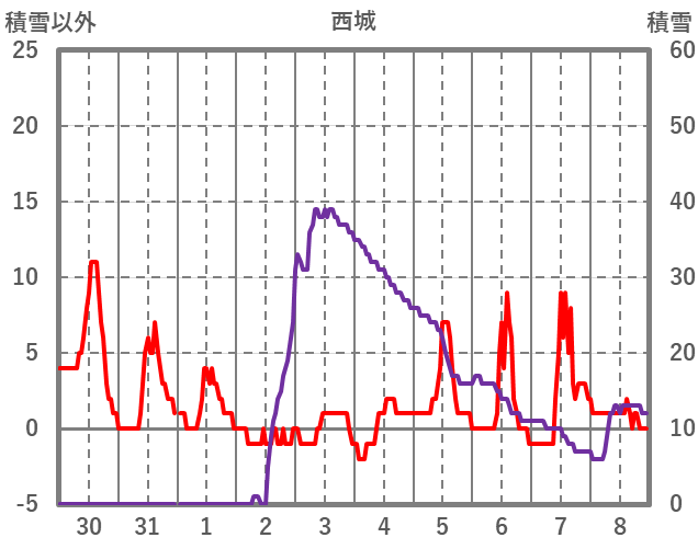 | 日 | 時 | 気温 | 降水 | 風向/風速 | 日照 | 積雪 | 降雪 |