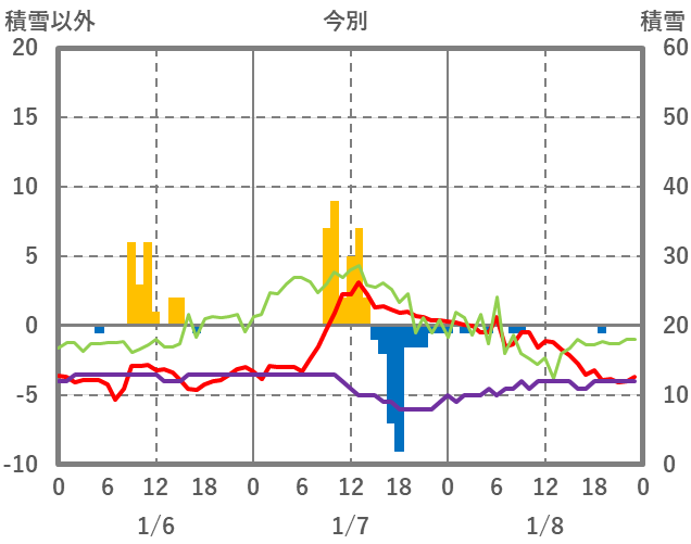 | 日 | 時 | 気温 | 降水 | 風向/風速 | 日照 | 積雪 | 降雪 |