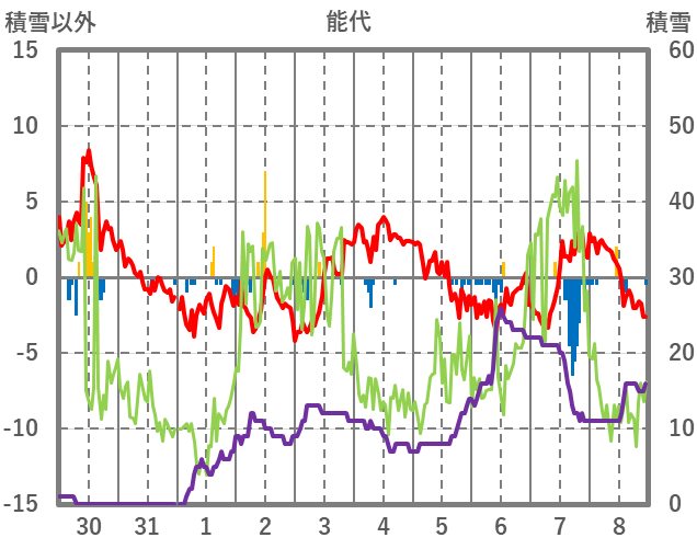 | 日 | 時 | 気温 | 降水 | 風向/風速 | 日照 | 積雪 | 降雪 |