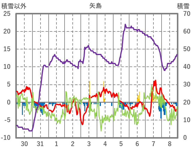| 日 | 時 | 気温 | 降水 | 風向/風速 | 日照 | 積雪 | 降雪 |