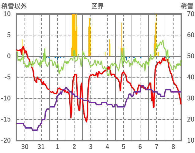 | 日 | 時 | 気温 | 降水 | 風向/風速 | 日照 | 積雪 | 降雪 |
