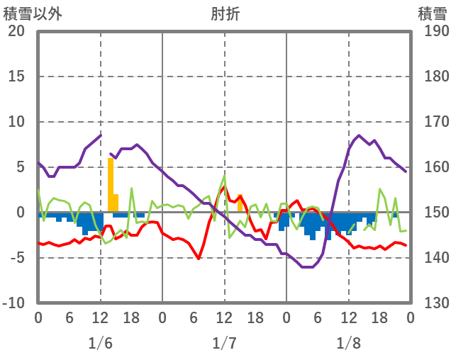 | 日 | 時 | 気温 | 降水 | 風向/風速 | 日照 | 積雪 | 降雪 |