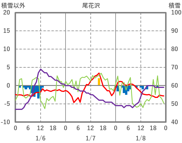 | 日 | 時 | 気温 | 降水 | 風向/風速 | 日照 | 積雪 | 降雪 |