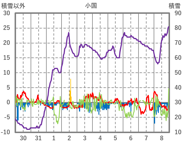 | 日 | 時 | 気温 | 降水 | 風向/風速 | 日照 | 積雪 | 降雪 |