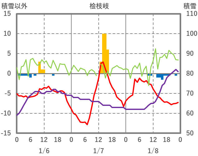 | 日 | 時 | 気温 | 降水 | 風向/風速 | 日照 | 積雪 | 降雪 |