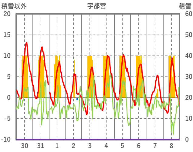 | 日 | 時 | 気温 | 降水 | 風向/風速 | 日照 | 積雪 | 降雪 |