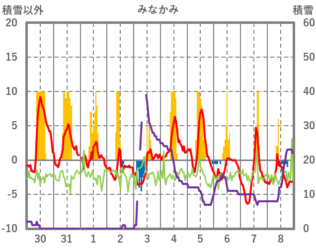 | 日 | 時 | 気温 | 降水 | 風向/風速 | 日照 | 積雪 | 降雪 |