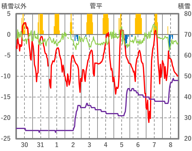 | 日 | 時 | 気温 | 降水 | 風向/風速 | 日照 | 積雪 | 降雪 |