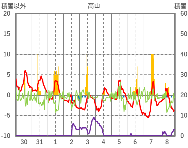 | 日 | 時 | 気温 | 降水 | 風向/風速 | 日照 | 積雪 | 降雪 |