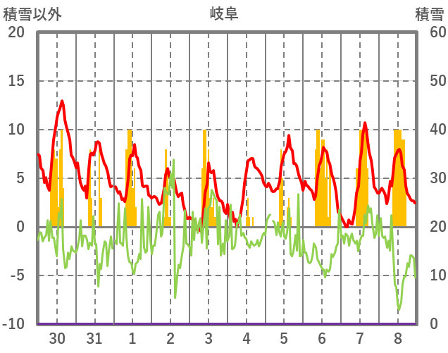 | 日 | 時 | 気温 | 降水 | 風向/風速 | 日照 | 積雪 | 降雪 |