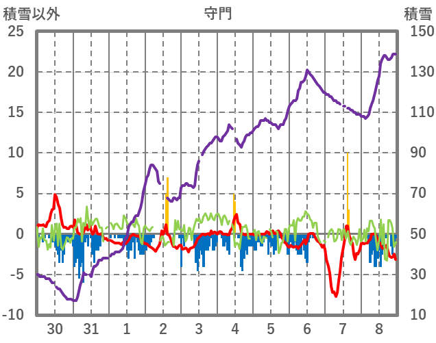 | 日 | 時 | 気温 | 降水 | 風向/風速 | 日照 | 積雪 | 降雪 |
