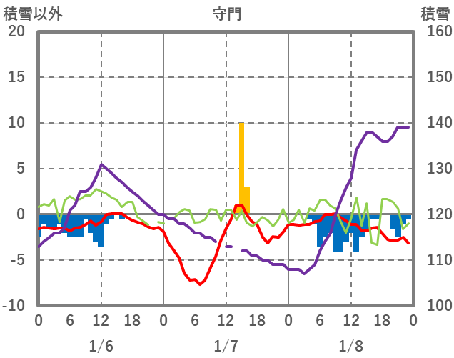 | 日 | 時 | 気温 | 降水 | 風向/風速 | 日照 | 積雪 | 降雪 |