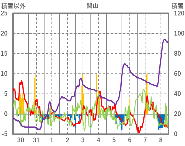 | 日 | 時 | 気温 | 降水 | 風向/風速 | 日照 | 積雪 | 降雪 |