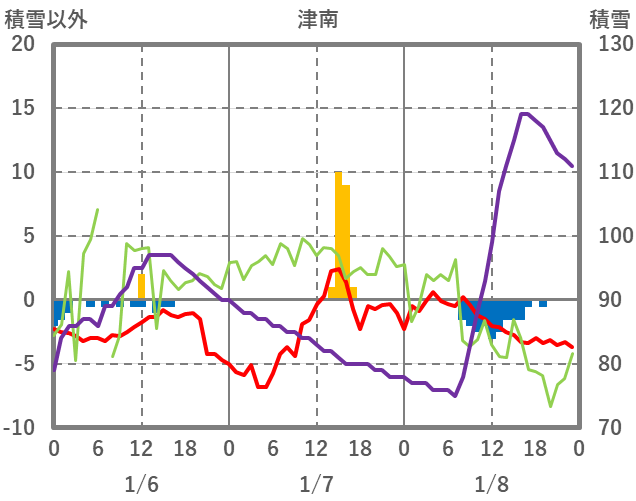 | 日 | 時 | 気温 | 降水 | 風向/風速 | 日照 | 積雪 | 降雪 |