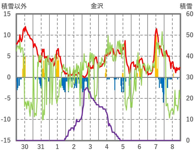 | 日 | 時 | 気温 | 降水 | 風向/風速 | 日照 | 積雪 | 降雪 |
