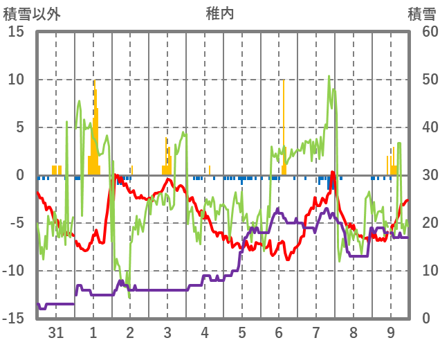 | 日 | 時 | 気温 | 降水 | 風向/風速 | 日照 | 積雪 | 降雪 |