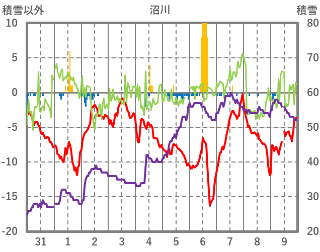 | 日 | 時 | 気温 | 降水 | 風向/風速 | 日照 | 積雪 | 降雪 |