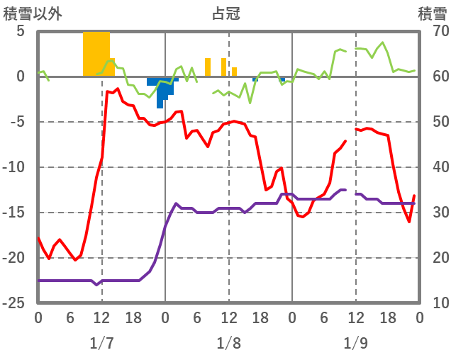 | 日 | 時 | 気温 | 降水 | 風向/風速 | 日照 | 積雪 | 降雪 |
