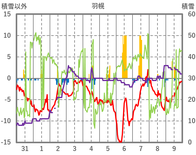| 日 | 時 | 気温 | 降水 | 風向/風速 | 日照 | 積雪 | 降雪 |