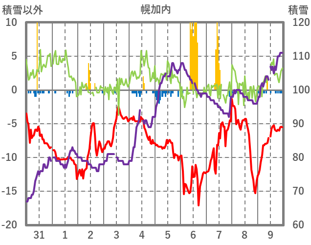 | 日 | 時 | 気温 | 降水 | 風向/風速 | 日照 | 積雪 | 降雪 |