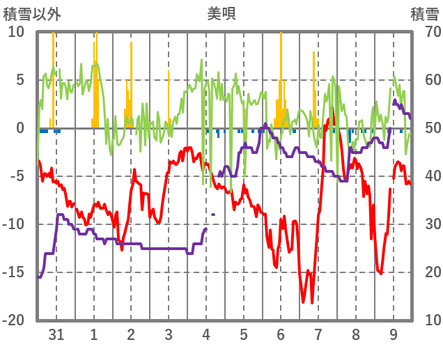 | 日 | 時 | 気温 | 降水 | 風向/風速 | 日照 | 積雪 | 降雪 |