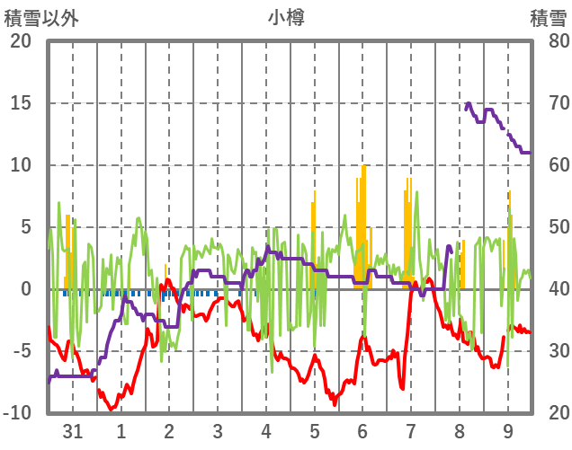 | 日 | 時 | 気温 | 降水 | 風向/風速 | 日照 | 積雪 | 降雪 |