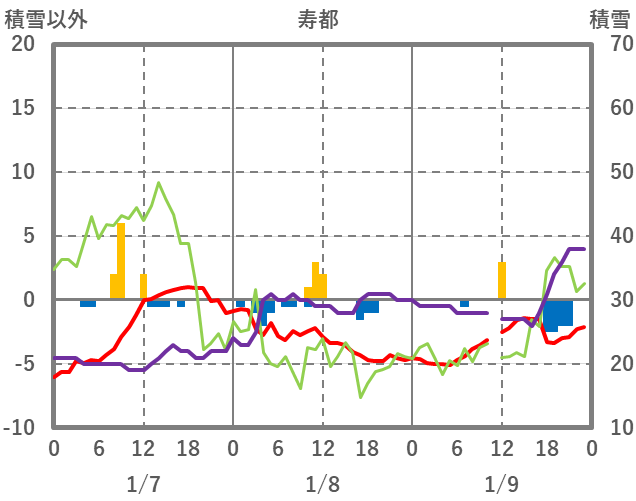 | 日 | 時 | 気温 | 降水 | 風向/風速 | 日照 | 積雪 | 降雪 |