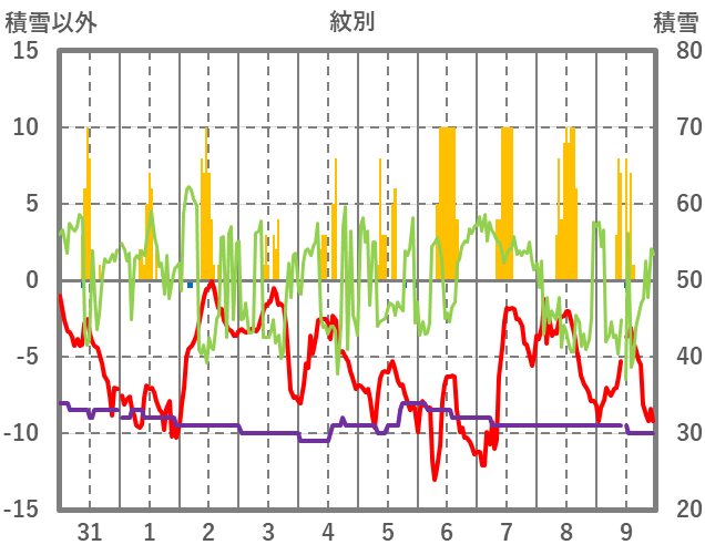 | 日 | 時 | 気温 | 降水 | 風向/風速 | 日照 | 積雪 | 降雪 |