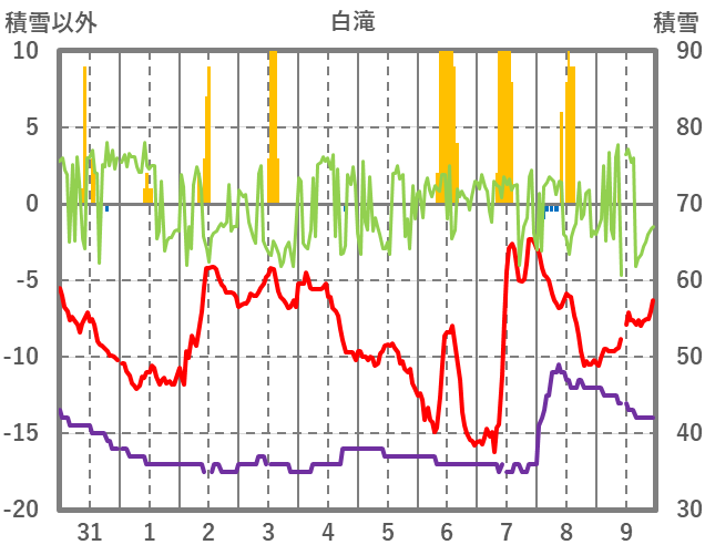 | 日 | 時 | 気温 | 降水 | 風向/風速 | 日照 | 積雪 | 降雪 |