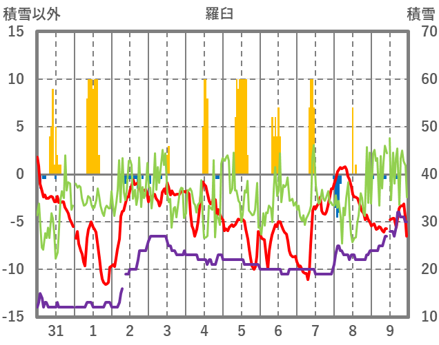 | 日 | 時 | 気温 | 降水 | 風向/風速 | 日照 | 積雪 | 降雪 |