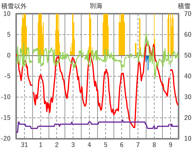 | 日 | 時 | 気温 | 降水 | 風向/風速 | 日照 | 積雪 | 降雪 |