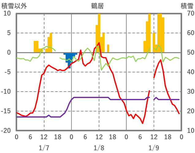 | 日 | 時 | 気温 | 降水 | 風向/風速 | 日照 | 積雪 | 降雪 |