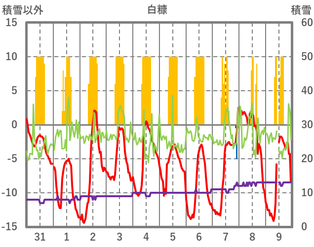 | 日 | 時 | 気温 | 降水 | 風向/風速 | 日照 | 積雪 | 降雪 |