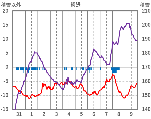 | 日 | 時 | 気温 | 降水 | 風向/風速 | 日照 | 積雪 | 降雪 |