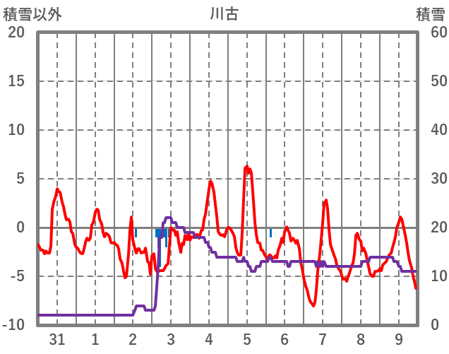| 日 | 時 | 気温 | 降水 | 風向/風速 | 日照 | 積雪 | 降雪 |