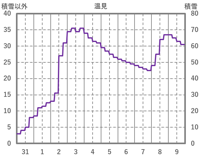 | 日 | 時 | 気温 | 降水 | 風向/風速 | 日照 | 積雪 | 降雪 |