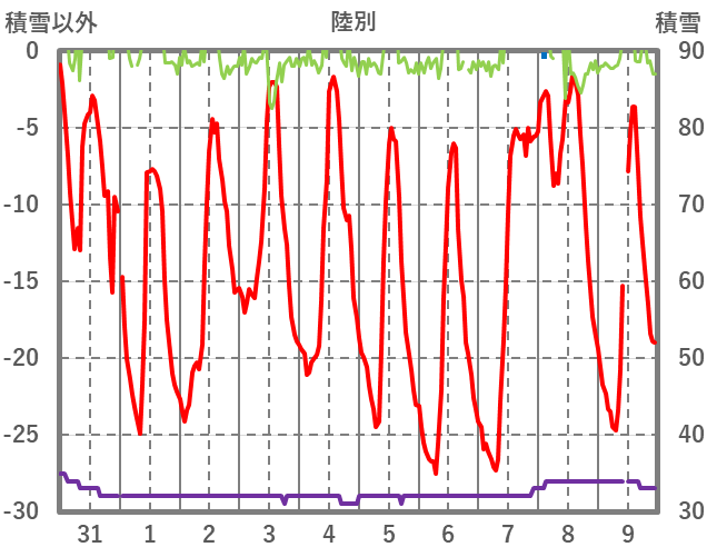 | 日 | 時 | 気温 | 降水 | 風向/風速 | 日照 | 積雪 | 降雪 |