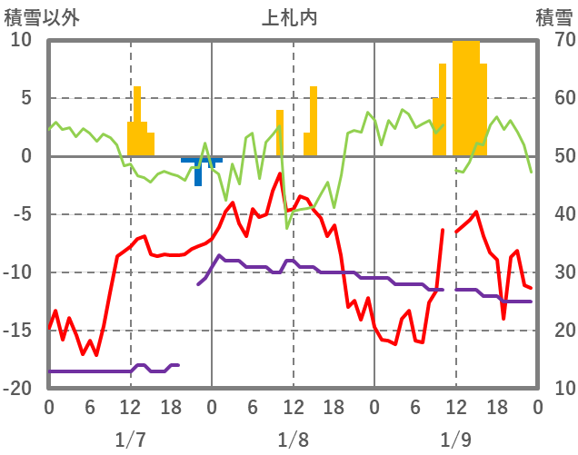 | 日 | 時 | 気温 | 降水 | 風向/風速 | 日照 | 積雪 | 降雪 |