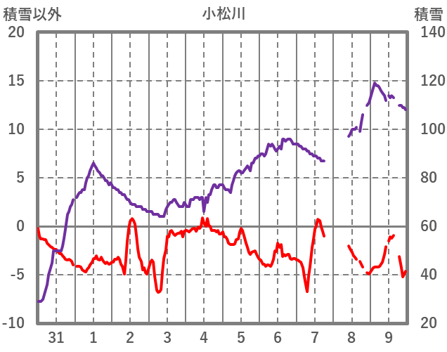 | 日 | 時 | 気温 | 降水 | 風向/風速 | 日照 | 積雪 | 降雪 |