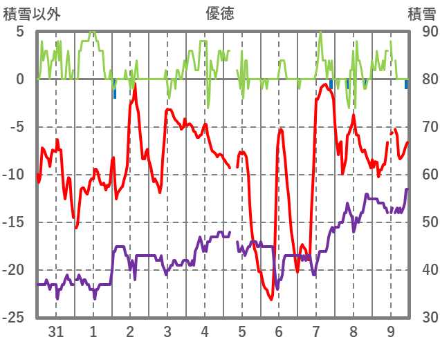 | 日 | 時 | 気温 | 降水 | 風向/風速 | 日照 | 積雪 | 降雪 |