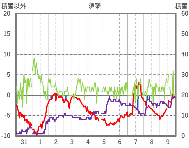 | 日 | 時 | 気温 | 降水 | 風向/風速 | 日照 | 積雪 | 降雪 |