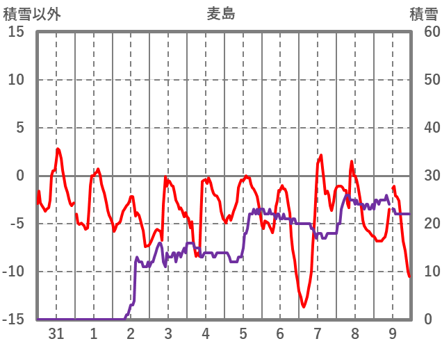| 日 | 時 | 気温 | 降水 | 風向/風速 | 日照 | 積雪 | 降雪 |