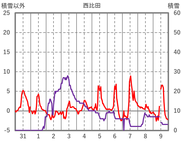 | 日 | 時 | 気温 | 降水 | 風向/風速 | 日照 | 積雪 | 降雪 |