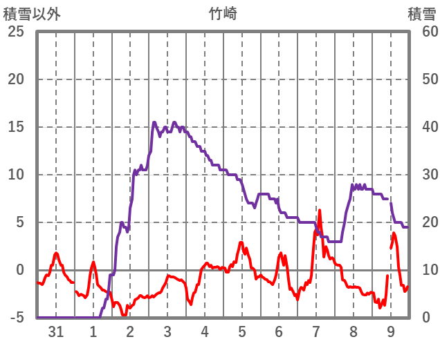 | 日 | 時 | 気温 | 降水 | 風向/風速 | 日照 | 積雪 | 降雪 |